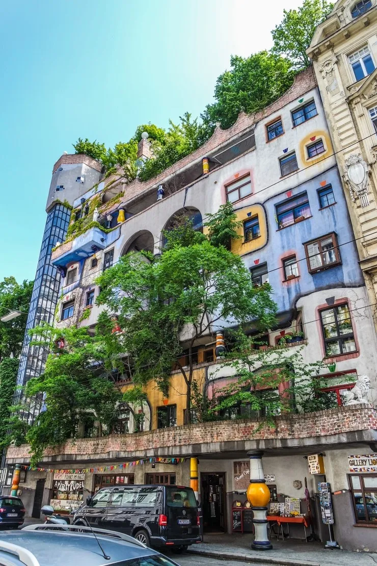 환경 예술가였던 훈데르트바서가 벽마다 서로 다른 색으로, 다른 표현 방식으로 디자인한 건축물이에요. 옥상에는 정원이 있는데요. 여러가지 종류의 수많은 나무를 심었다고 하네요.