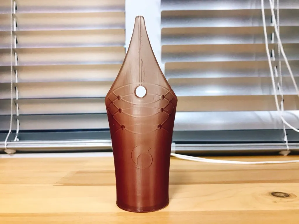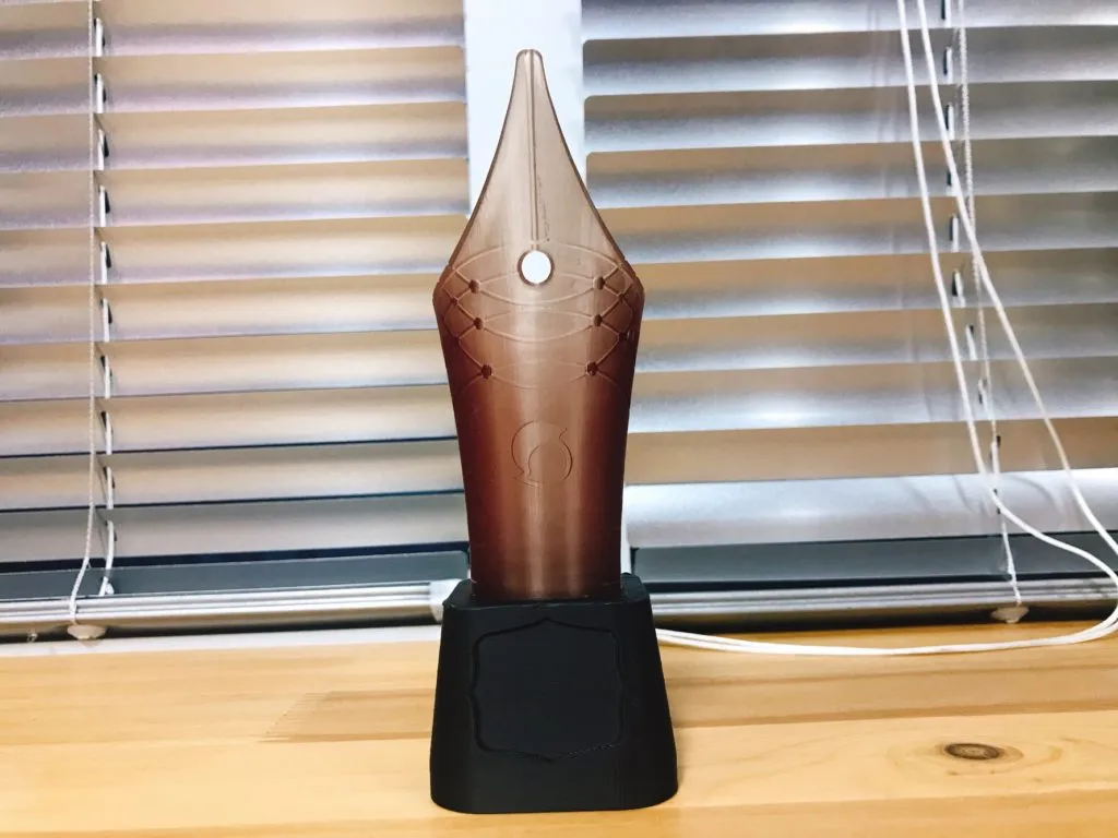 Steemit KR community awards 문구를 새겨넣을 하단 받침대를 출력해서 펜촉을 올려놓아 보았습니다. 받침대가 높아지니 수정하기 전하고 크기는 비슷합니다.