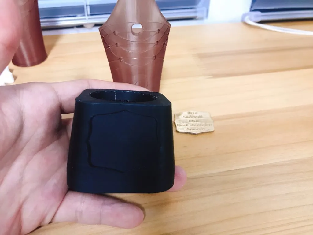 드디어 트로피가 완성되었습니다. ^^ 3d 프린터 원재료가 반투명한 짙은 갈색이라 블랙과 골드 조합에 잘 어울리는 것 같습니다. 반투명이라 빛을 비추니 좀 더 영롱한 느낌도 나구요ㅎㅎ 원래는 금색스프레이로 마감을 해야하지만..