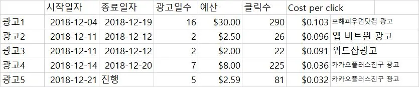 - 하루 동안 소모되는 광고 예산(budget) 1~2$ 정도입니다. (0.52$, 1.14$ 1.00$ 1.25$ 1.88$)