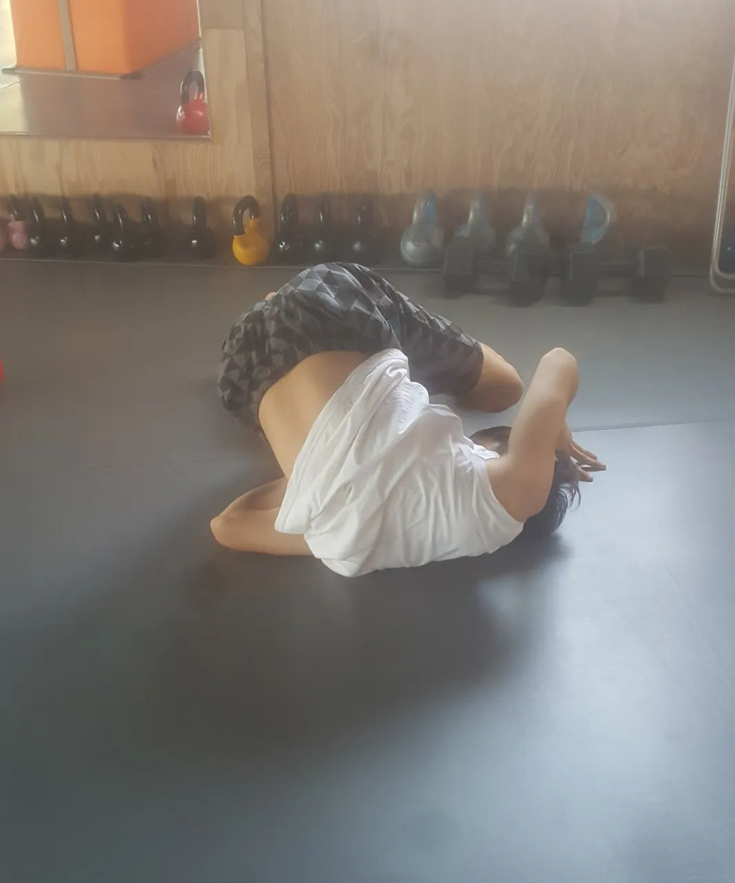 이때 대부분의 사람들은 머리로 돌려고 합니다. 머리로 돌려면 물구나무 식으로 해야 합니다. 그러나 주짓수 뒤구르기는 그런식이 아니기에 머리를 한 쪽으로 치우쳐서 목 과 승모근 과 어깨를 받쳐서 뒤로 구르는 것입니다.