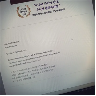 레일라 슬라마나라는 여성작가의 소설 달콤한 노래.. 이 작품으로 이 작가는 2016년 공쿠르상을 수상했다고 한다.