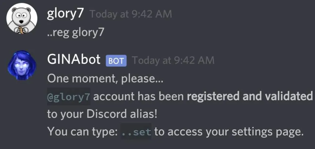 - 투표자 등록 확인: 1~2분 후에 동일 채널에서 ..reg 스팀잇아이디 를 다시 쳐보면 정상적으로 진행되었을 경우 다음과 같이 "registered and validated" 라고 나옵니다.