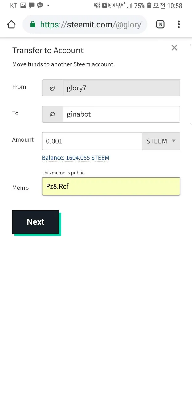 그러면 저렇게 실제 아이디 주인인지 확인을 위해서 0.001스팀/스달을 @ginabot으로 보내달라고 합니다. 주의할 점은 저기 있는 메모를 그대로 메모란에 붙여야 합니다. 저의 경우에는 Pz8.Rcf