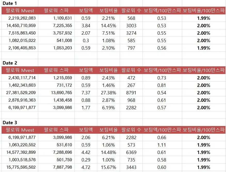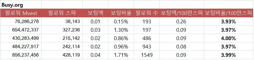 맨 오른쪽 줄이 결론입니다. 내 팔로워 스파가 100만이면, busy.pay가 2%의 보팅 비율로 보팅해줍니다. 액수는 그때그때 스팀가격이나 busy의 보팅 파워가 얼마나 되는지에 따라 달라지겠지요. 수식으로 생각하면, 팔로워 스파/100만 * 2% 가 보팅비율입니다. (그래서 팔로워 스파가 13.69백만이신 분은 보팅비율이 27.38% 이지요). 팔로워 수나 내 스파는 아무 상관없습니다.