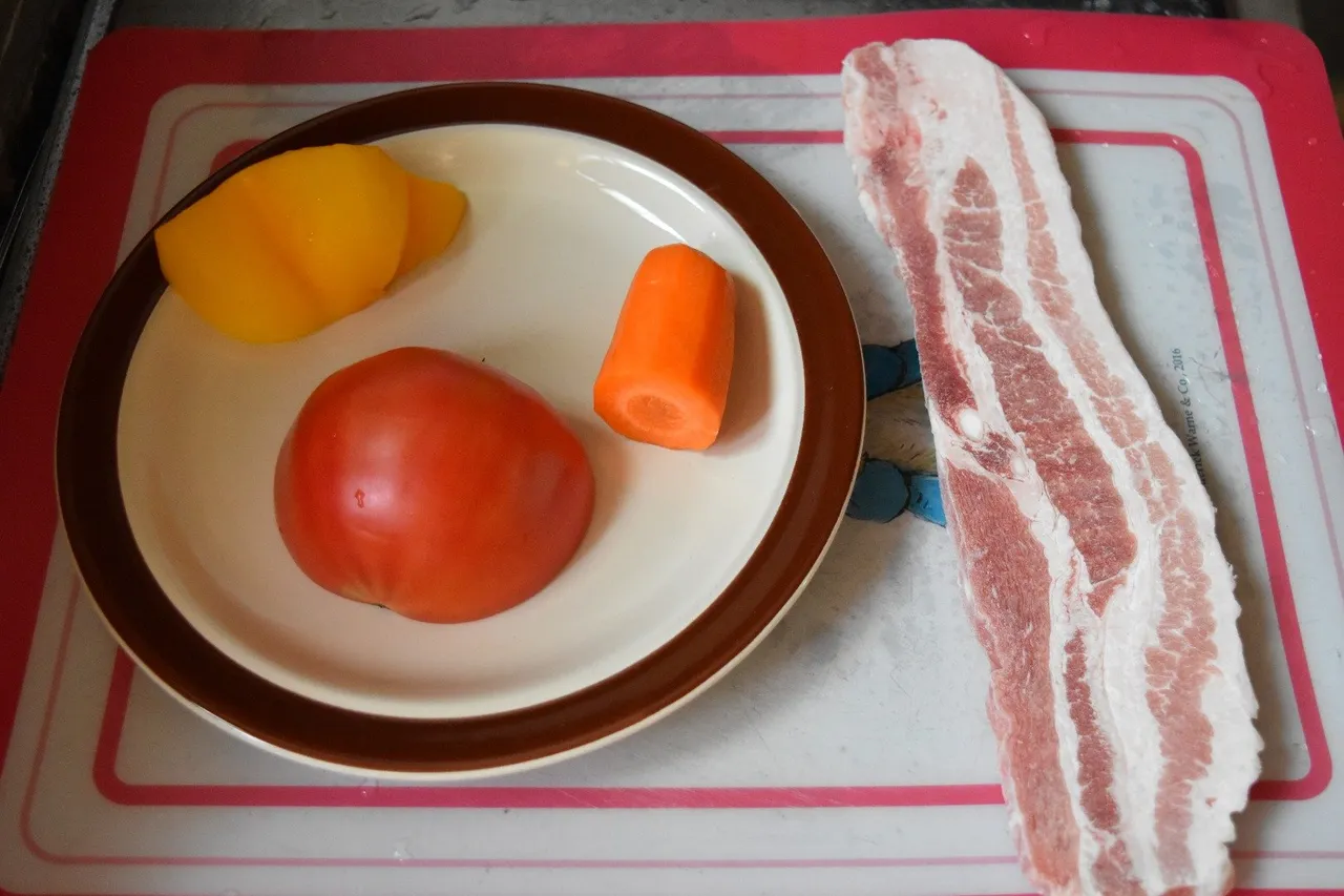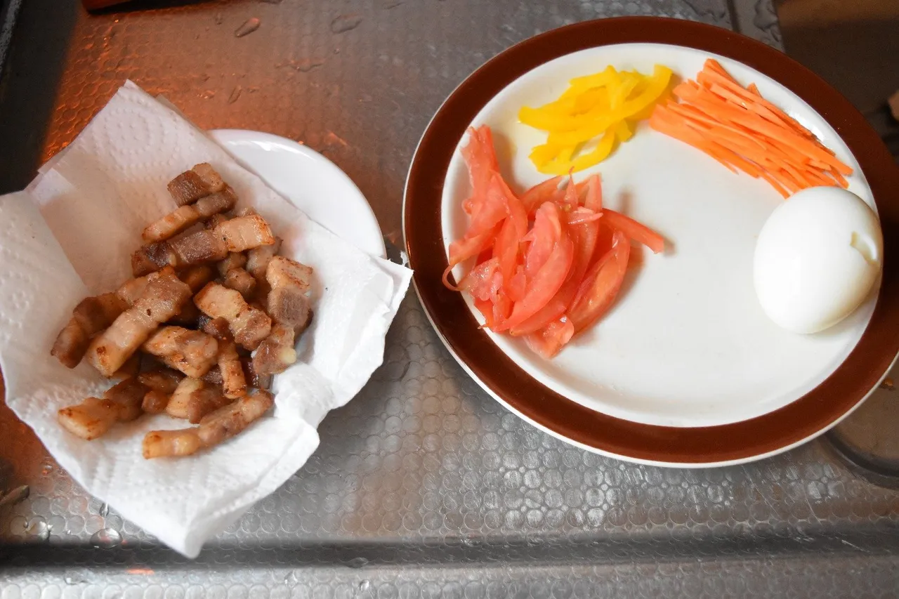 일단 집에 있는 재료인 파프리카,토마토,오이,삼겹살 +계란 입니다.