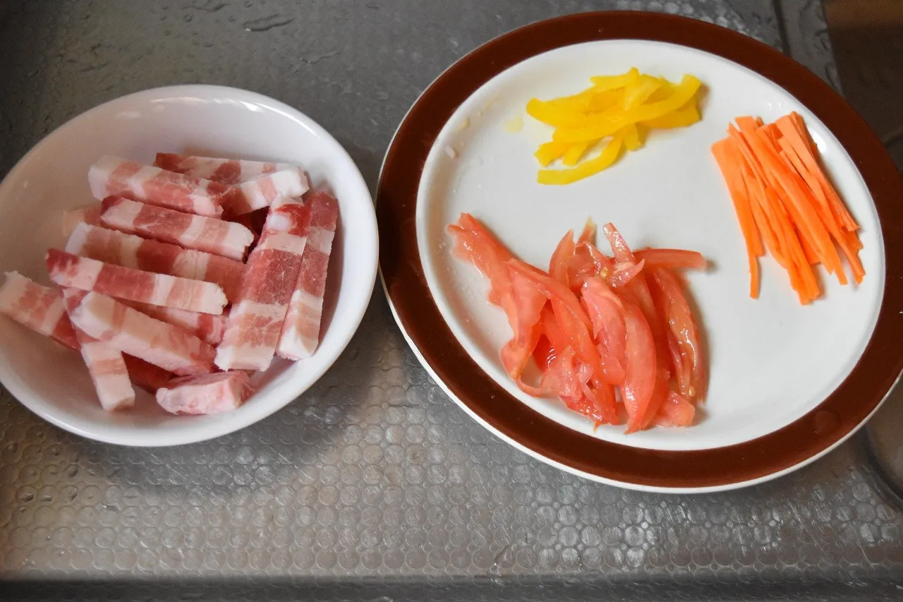 재료들을 국수와 먹기좋은크기로 채썰어주시고 삽겹살도 빨리 익힐수있도록 썰어놔주세요.