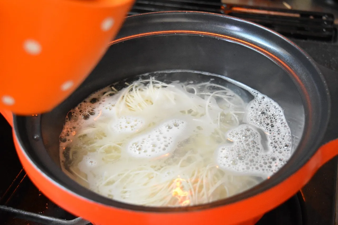 면 삶는법 요약: 거품이 일어나면 받아놓은 물의 3분의1을 넣는다. 이것을 3번반복하고 마지막에 거품이 일어나면 뺀다!