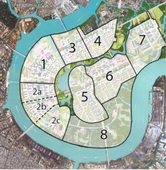 어마어마한 교통 체증으로 몸살을 앓는 호치민 1군 바로 건너편에 위치한 이 한적한 지역이 Thu Tiem (투티엠) 이다. 점점 그 기능이 마비될 지경에 이르러 가는 호치민 1군의 여러 문제점 때문에 베트남 정부에서 야심 차게 개발을 진행하는 곳이 2군, 그중에서도 사진의 투티엠 지역을 핵심이라 칭할만하다. 자본 조달이 여의치 않아 해외 건설사와 베트남 내 건설사들을 묶어 joint company 형태로 개발에 박차를 가하고 있는데, 개발 지구는 아래와 같이 나뉜다.