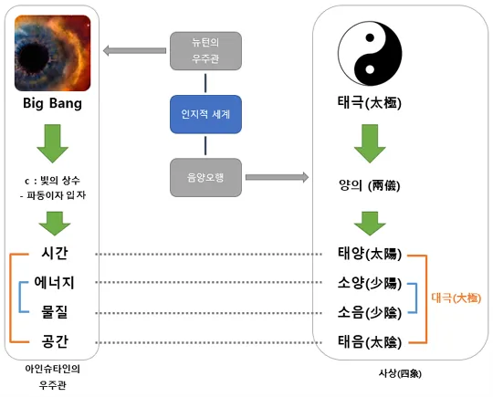 c라는 공통인자를 통해 엮이는 시간, 에너지, 물질, 공간이라는 4가지 요소는 우주를 구성하는 가장 기본적인 단위가 되는데, 이는 사상의학에서 양의라는 법칙으로 분화되는 사상(四象)의 개념과 일맥상통합니다. 우주의 모델로 소우주인 인간과 체질을 설명해본다면, 우주는 시간과 에너지와 물질과 공간이라는 요소를 통해서만 완전히 설명될 수있지만, 이를 바라보는 관점은 마찬가지로 시간이나 공간적 차원에서, 혹은 물질이나 에너지 차원에서 설명하느냐에 따라 4가지로 그 내용이 나뉠 수 있는 것처럼, 인간 역시 주로 어떠한 관점을 택하고자 하느냐에 따라 4가지의 체질로 나뉘게 된다고 이해할 수 있을 것 같습니다. (물론, 정설화된 내용은 아닙니다.)