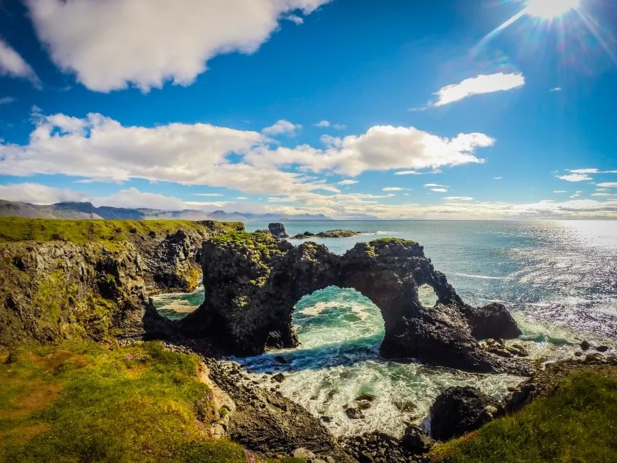 Arnarstapi 마을에 있는 Gatklettur 입니다. 파도에 의해서 구멍이 뻥 뚫린 바위는 제 마음도 뻥 뚫어주네요. 아름다운 곳이어서, 의외로 많은 관광객들이 와서 캠핑하는 곳이에요.