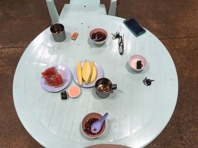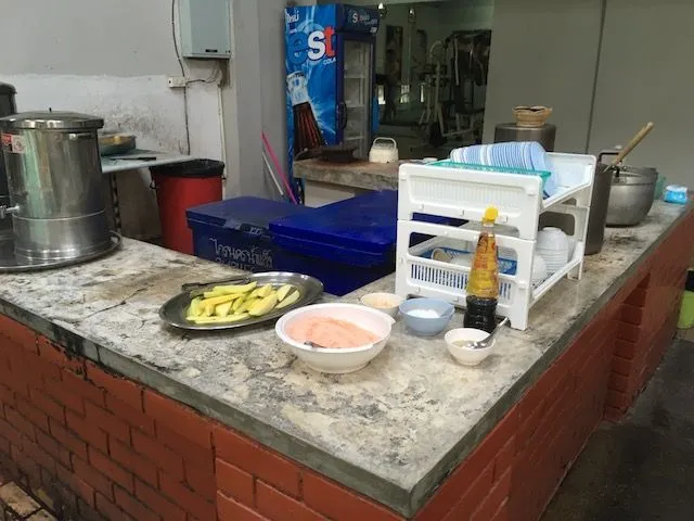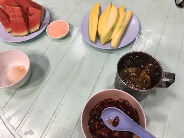 저 테이블 위의 과일요? 공짭니다. 100% 공짜입니다. 목욕탕 한 쪽엔 얼음 동동 뛰운 태국 전통차, 콩 삶은 물, 망고 - 부드러운 망고는 안주더군요 좀 딱딱하지만 -, 수박, 삶은 계란까지! 과일 찍어먹는 소금 - 태국 사람들은 과일을 소금에 찍어 먹습니다 - 그리고 삶은 계란용 특수 소스까지. 결코! 결코! 남는 장사입니다. 약 6천원 내고 들어와서 과일 실컷 먹고... 개이득! 무한정이거든요. 그냥 가져다 먹으면 됩니다. 단, 살이 더 찔 수는 있겠습니다. 그래서 안가져다 먹으면요? 테이블이나 접시가 비어있으면 반바지 입은 직원이 서빙을 합니다. 시원하게 물 한잔 마시고 옆을 둘러보고 나서 고개를 돌리면 놀라운 일이 벌어지죠. 어느새 컵이 찰랑찰랑 채워져 있습니다.