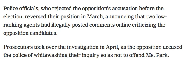 대선 전 야당의 혐의를 완강히 부인했던 경찰은 지난 삼월엔 말을 바꿔 국정원의 두 말단 직원이 야당 후보에 대한 비방글을 불법적으로 온라인 상에 올렸다고 발표한 바 있다.
