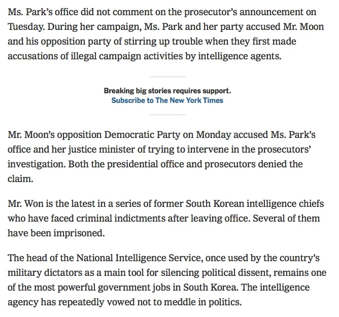 | 영어 / The New York Times | https://www.nytimes.com/2013/06/12/world/asia/south-koreas-ex-intelligence-chief-accused-of-meddling-in-presidential-race.html