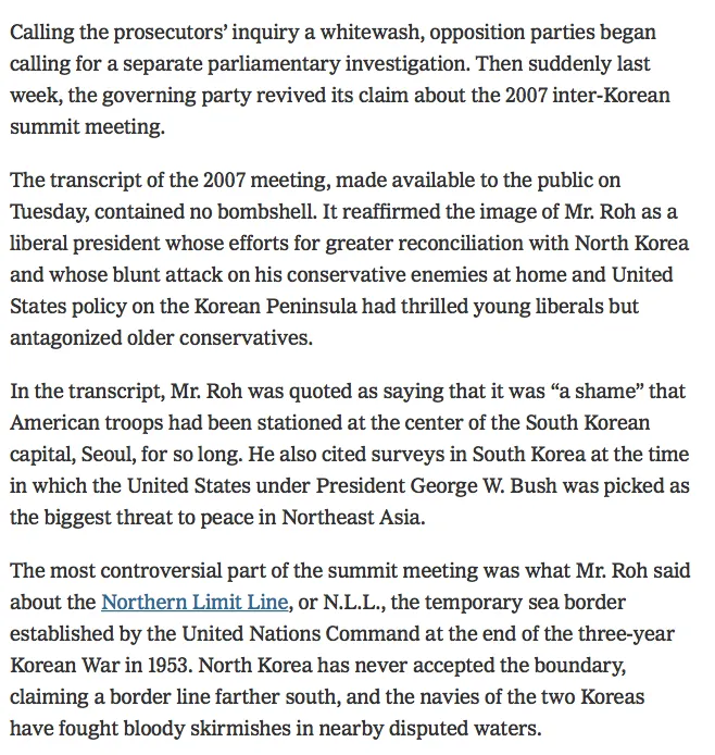 화요일 공개된 2007년 정상회담 녹취록은 어떤 충격적인 사실도 포함하고 있지 않았다. 이것은 그저 북한과의 화해를 위한 부단한 노력을 보여주었으며 한편으로는 정치적인 정적이었던 국내 보수주의자들과 한반도에 대한 미국의 정책에는 공격을 멈추지 않았던, 그래서 젊은 진보주의자는 환호했고 노년의 보수주의자들은 꺼려했던, 노무현 대통령의 진보적 이미지를 다시 한번 확인해주는 정도였다.