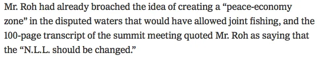 Mr. Roh had already broached the idea of creating a “peace-economy zone” in the disputed waters that would have allowed joint fishing, and the 100-page transcript of the summit meeting quoted Mr. Roh as saying that the “N.L.L. should be changed.”