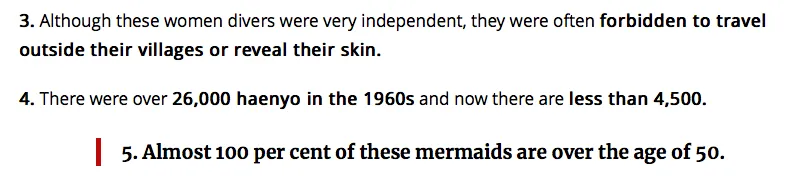 | 영어 / India Today | https://www.indiatoday.in/education-today/gk-current-affairs/story/mermaids-of-korea-haenyo-sea-divers-last-generation-1377737-2018-10-29