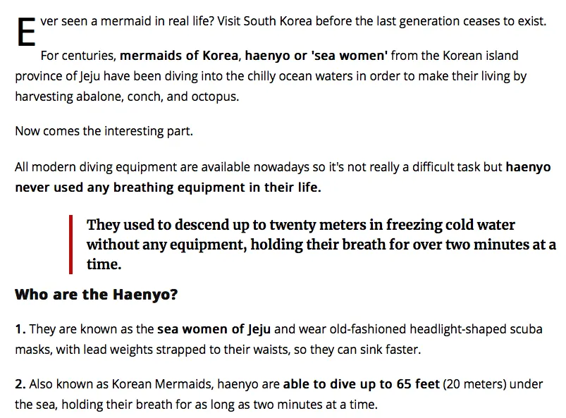 ... For centuries, mermaids of Korea, haenyo or ‘sea women’ from the Korean island province of Jeju have been diving into the chilly ocean waters in order to make their living by harvesting abalone, conch, and octopus. Now comes the interesting part. All modern diving equipment are available nowadays so it’s not really a difficult task but haenyo never used any breathing equipment in their life. They used to descend up to twenty meters in freezing cold water without any equipment, holding their breath for over two minutes at a time. Who are the Haenyo? 1)They are known as the sea women of Jeju and wear old-fashioned headlight-shaped scuba masks, with lead weights strapped to their waists, so they can sink faster. 2)Also known as Korean Mermaids, haenyo are able to dive up to 65 feet (20 meters) under the sea, holding their breath for as long as two minutes at a time. 3)Although these women divers were very independent, they were often forbidden to travel outside their villages or reveal their skin. 4)There were over 26,000 haenyo in the 1960s and now there are less than 4,500. 5)Almost 100 per cent of these mermaids are over the age of 50. ... ... 실제로 인어를 본 적이 있는가? 마지막 세대가 끝나기 전에 한국을 방문하시라. 수세기 동안, 한국의 인어, 즉 ‘바다 여인’이라 불리는 해녀들은 한국의 섬 제주도의 차가운 바닷물에 뛰어들어 전복, 조개, 문어 등을 잡아 생계를 유지해 왔다. 흥미로운 부분은 바로 이렇다. 요즘은 모든 현대식 다이빙 장비들이 있어 그다지 어려운 작업이 아니지만 해녀들은 평생 어떠한 호흡장비도 사용해 본 적이 없었다. 그들은 얼음같이 차가운 물 속에서 어떤 장비도 없이 해저 20미터 아래까지 내려가곤 했으며, 한 번에 2분 이상 숨을 참는다. 해녀들은 누구인가? 그들은 제주의 바다 여인으로 알려져 있으며 헤드라이트 형태의 구식 스쿠버 마스크를 착용하고 더 빨리 잠수할 수 있도록 허리춤에 납을 매단다. / 한국의 인어라고도 알려진 해녀들은 해저 최대 65피트 (20미터) 까지 잠수할 수 있으며 한 번에 2분까지 숨을 참을 수 있다. / 이 여성 다이버들은 매우 독립적이지만, 종종 자신들이 사는 마을 바깥으로 나가거나 피부를 드러내는 것이 금지되었다. / 1960년대에는 26,000 명이 넘는 해녀들이 있었으며 현재는 그 수가 4,500 명 미만이다. / 이 해녀들의 거의 100%가 50 세 이상이다. ... headline_ Korea's real life mermaids will soon be no more: About the last generation Haenyo