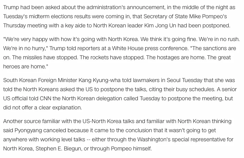 ... 트럼프 대통령은 화요일 중간 선거 결과가 나오기 시작하는 한밤중, 마이크 폼페이오 국무장관과 북한 지도자 김정은 위원장의 핵심 보좌관의 목요일 만남이 연기되었다는 행정부의 발표에 대한 질문을 받았다.