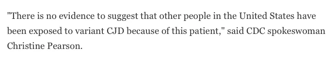 “There is no evidence to suggest that other people in the United States have been exposed to variant CJD because of this patient,” said CDC spokeswoman Christine Pearson.