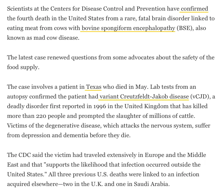 이 사례는 5월에 사망한 텍사스주의 한 환자와 관련된다. 부검결과 그 환자는, 영국에서 1996년에 처음 보고된 것으로 220명 이상의 사망자를 내고 즉각적으로 수백만 마리의 소를 도살처분케 했던 치명적인 질병인 변종 크로이츠펠트-야콥병(vCJD)을 앓았던 것으로 확인됐다. 신경계를 공격하는 이 퇴행성 질환의 희생자들은 사망하기 전 우울증과 치매로 고통을 겪는다.
