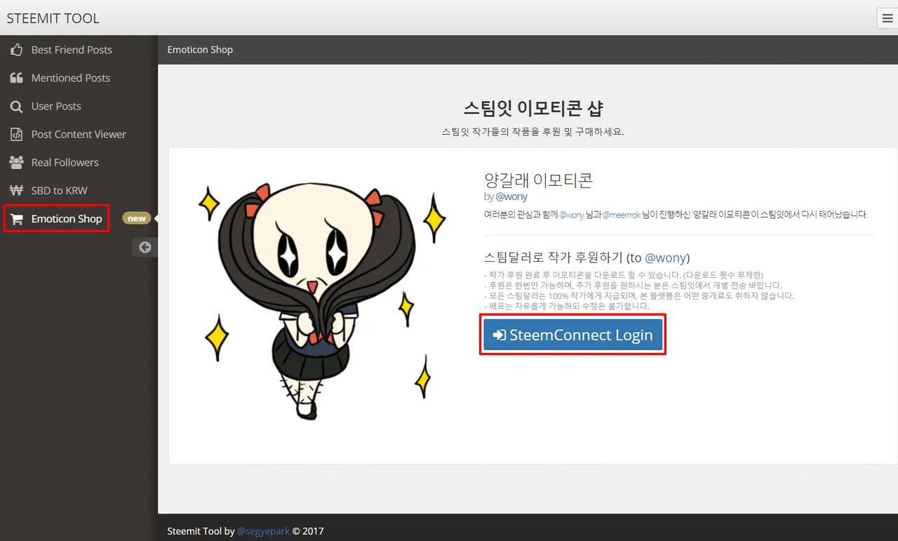 세계박: 현재 @wony 님의 이모티콘이 올라와 있죠. 카톡에서 인정하는 공식 이모티콘은 아니지만 우리 스팀잇 내에서는 인기콘이죠? 30분 정도가 후원을 하고 다운로드 받은 거로 알고 있습니다. @twin*****님을 표현했다는 설도 있죠.^^