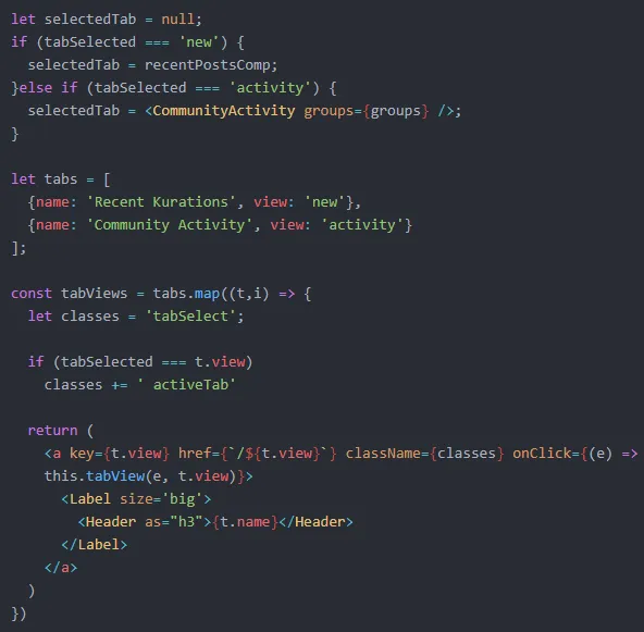 array to loop through and display the view. When the component updates with a state change for a change int he tab selection, a check is made to see which tab should be shown on the page by adding an activeTab