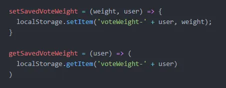 Two functions are called to set and get the vote weight which is stored in localStorage. When the vote weight is called, it gets the value from localStorage. And when the vote is finally sent, a new vote weight is set for the localStorage.