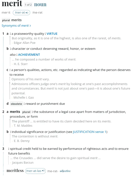 "The idea of merit is in fact never clearly defined; rather, it seems to be a form of recognition, an acknowledgement that “this person is valuable insofar as they are like me.”"