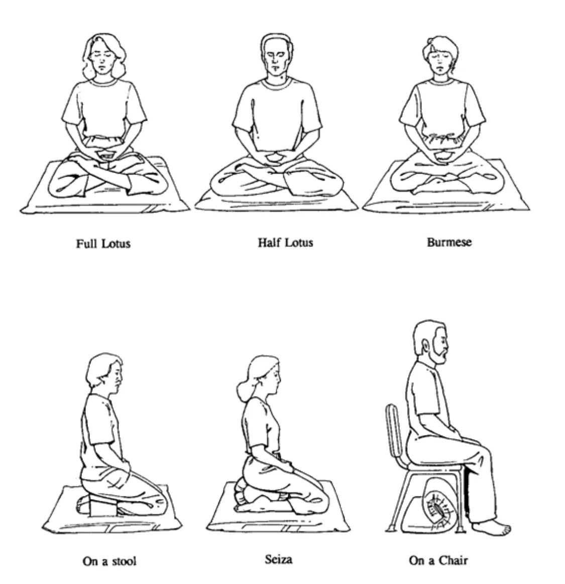 - Sitting and hand positions: There are many ways to sit for meditation practice, some examples are shown below. Sit comfortably with the spine erect but not too stiff. You can sit on the floor with crossed leg (or lotus position if you prefer) or on the chair. It is preferable not to lean on the wall or back support of the chair. At the beginning stage, the most important is to sit in a way that is most comfortable to you so you don’t have to move your body much during meditation.