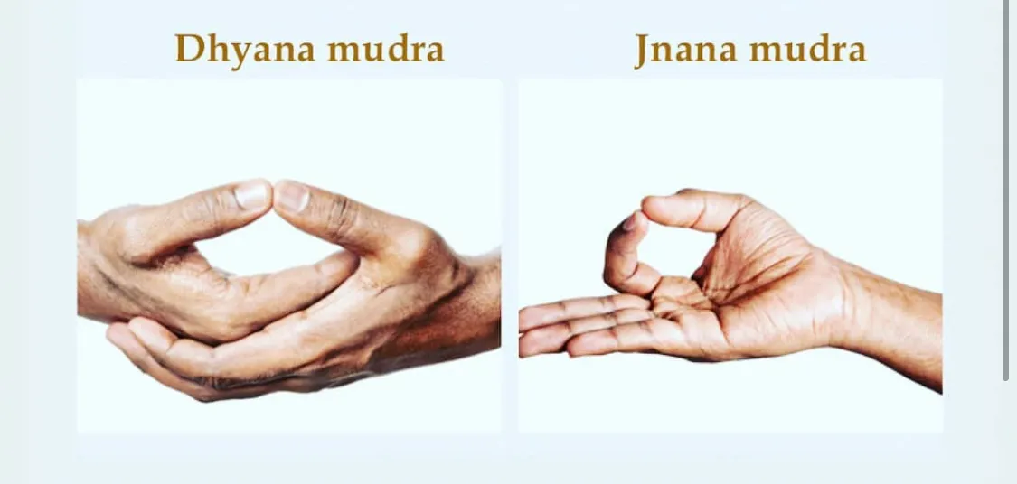 Again, many different ways to put your hands while meditating including Dhyanna mudra, Jnana Mudra as shown below. Although different hand positions has specific purpose we will leave those details for another time. At this stage put your hands in any of following position or you can put your hand just on the knees palms down or up without specific posture.