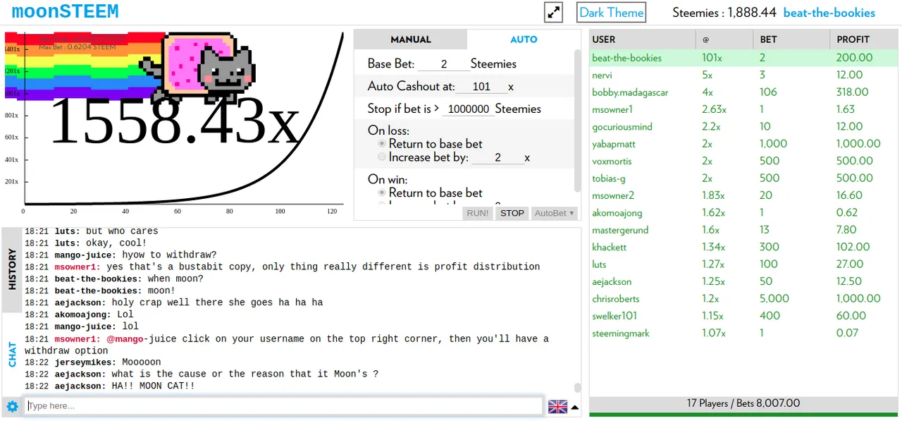 Pure technically this system works and casinos counter it by having minimum and maximum limits on their tables. Moonsteem is this regard is different since the minimum and maximum bets are so wide between 1 and 2146400 currently. This makes it technically possible to run a martingale system where you can survive 22x going below 2.00. The odds on that happening are insanely low. Since 1 Steem represents 1 million Steemies which is the native currency of the game it's not going to make anyone rich to run a martingale system that goes 22x deep.