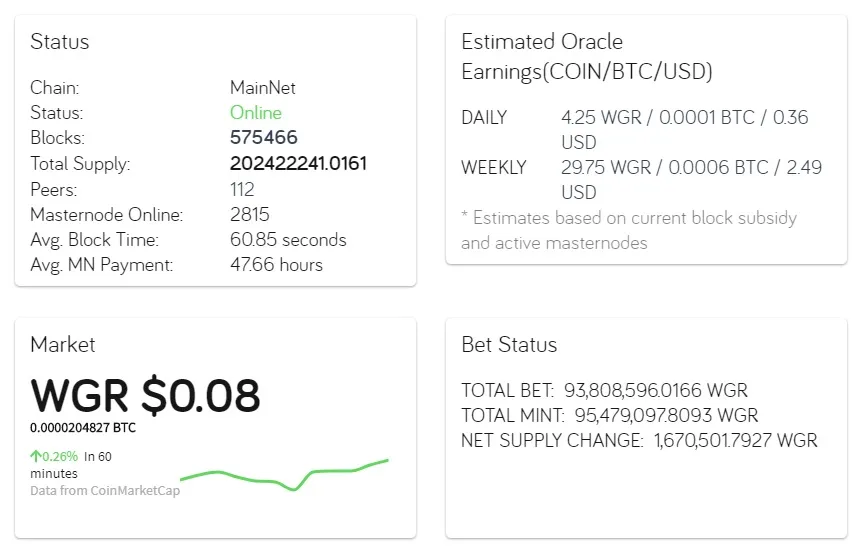 Wagerr continues as usual with very little updates from the devs while their betting platform continues to run and lose WGR to bettors most likely because they don't really adjust their odds quickly enough. They almost reached a turnover of 100 Million WGR that has been bet and had to mint 1.67 Million extra WGR to pay out winners.