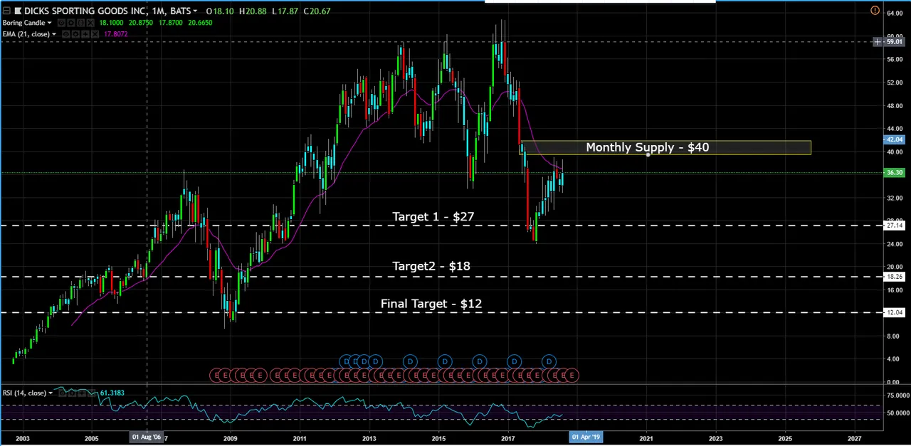 With all that said, I think Dick’s is a long term short. Lets go to the monthly charts to see how low Dick’s can go over time.