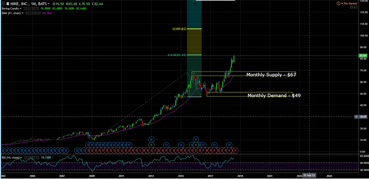 So how high can Nike’s stock price go, lets go to the charts. In May, price broke through the monthly supply at $67 to make all-time new highs. Thus, there is no supply above.