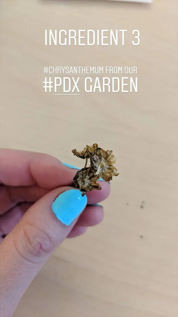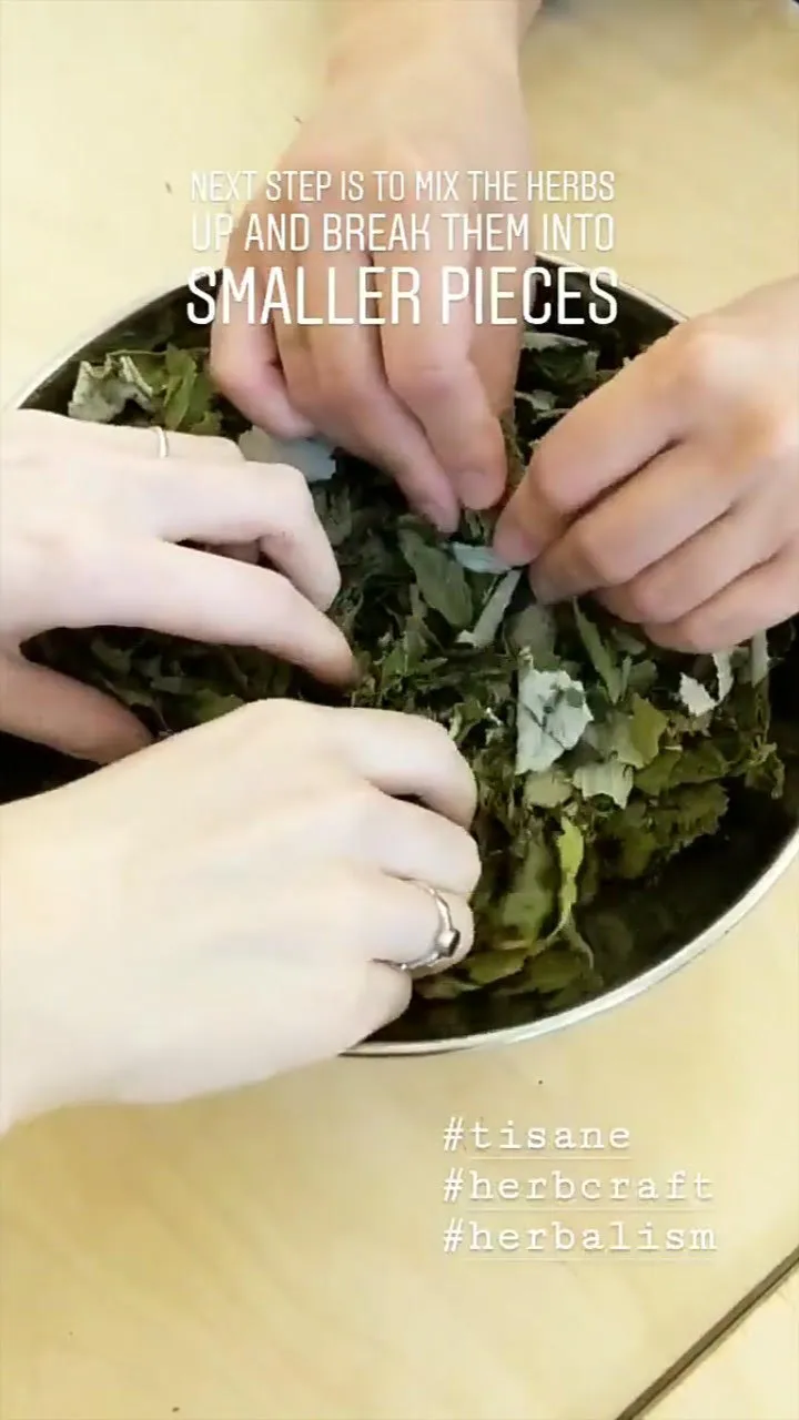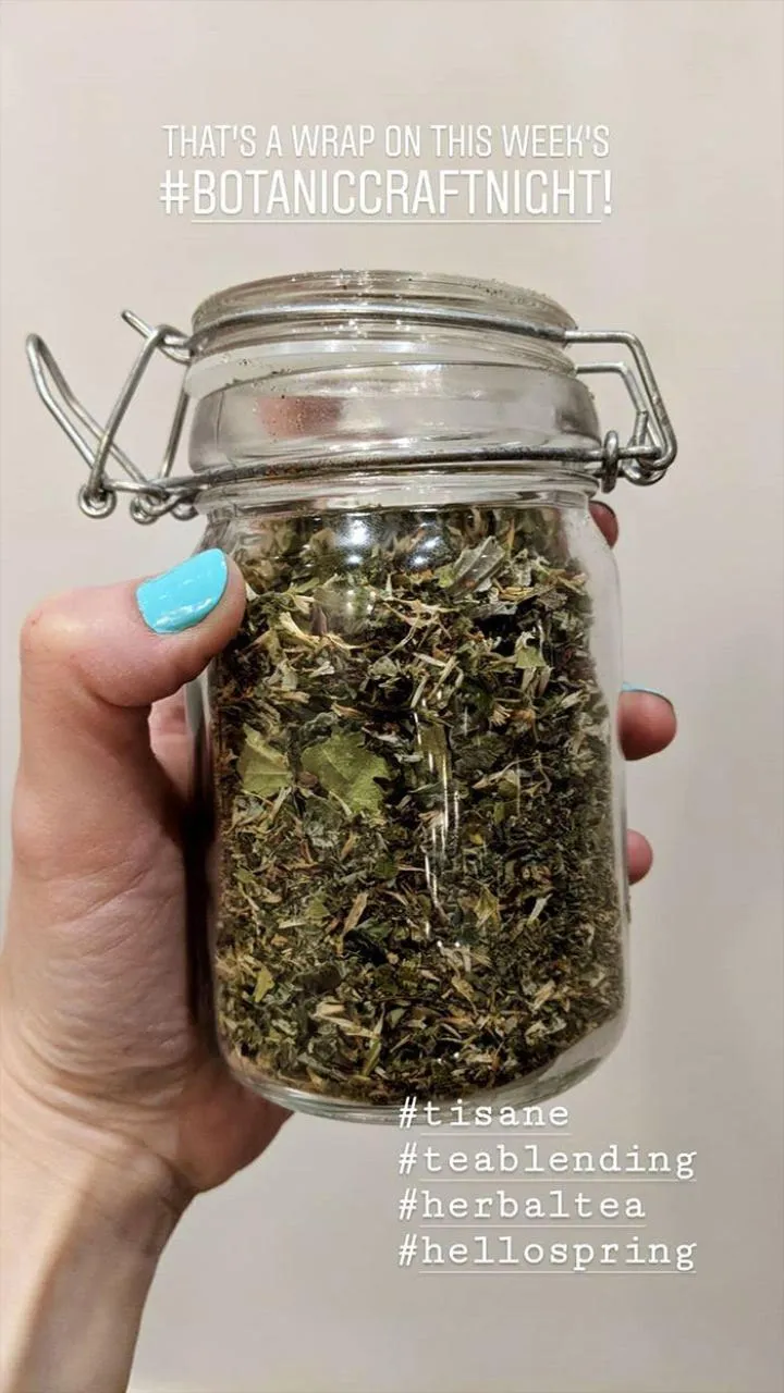 Before we started, we had some organic snacks and chatted with each other, then took turns washing hands in preparation of the tea making. Ivy went through and spoke to us about each of the herbs we were putting into the blend, pulling some from each jar with tongs and placing it in a little bowl. We passed each of the herbs around to observe, smell, and taste them. All of it was dried which makes the plants a bit harder to distinguish. Some if not all of them were foraged for & harvested locally.