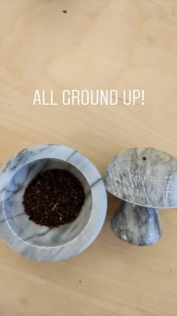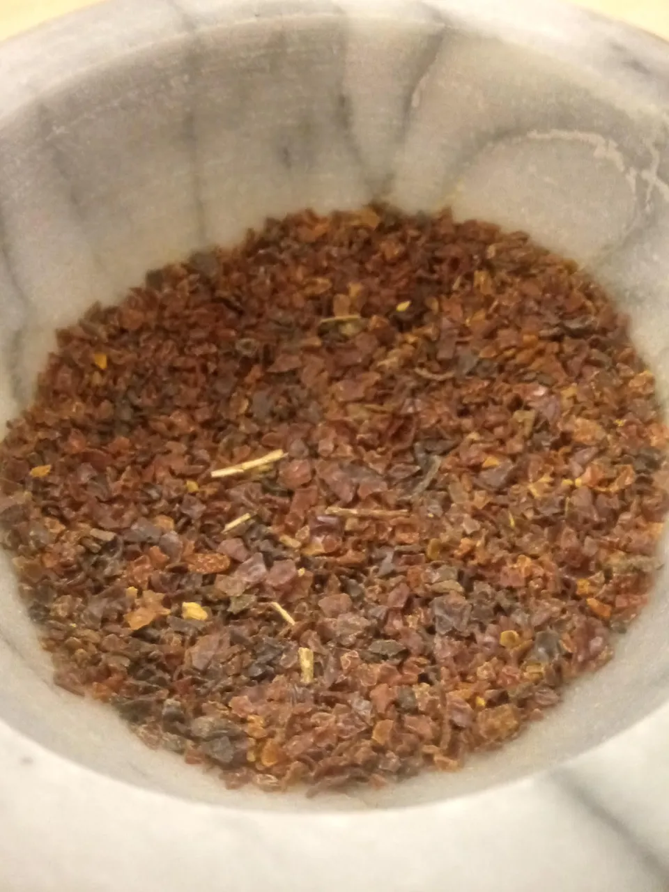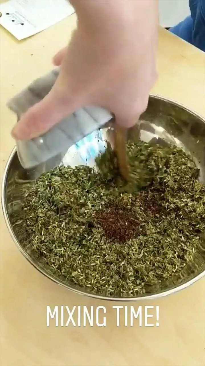 After putting everything together into a bowl, the next step of the process was to crush it all up. We kept the rose hips separate and ground it up with a mortar and pestle before mixing it in with the rest of the blend.