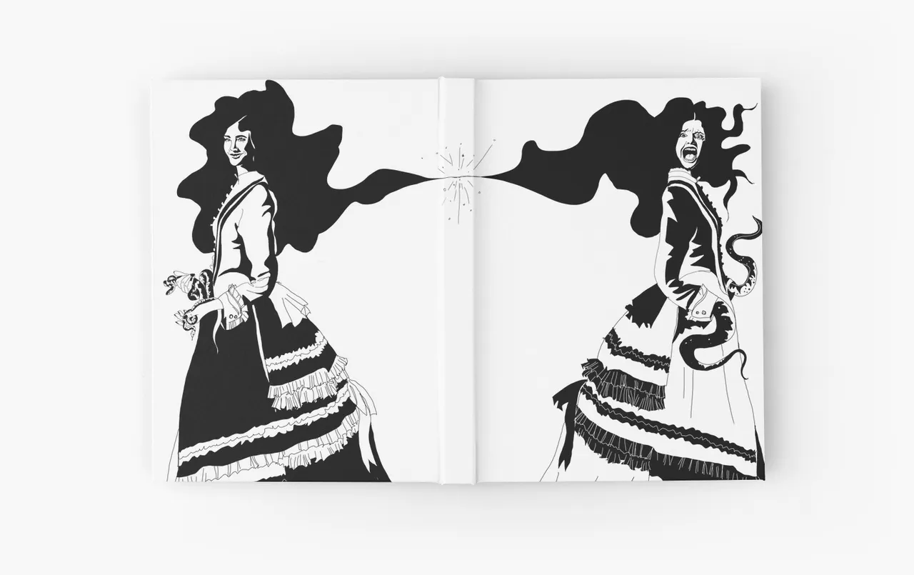 This piece was part of my own #inktober theme of witches with their familiars, but in this one I wanted to play on the idea of the familiar spirit of the snake being a mirror of the witch herself or perhaps it is just her twin, who can say?