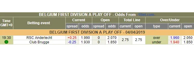 04/04/2019 | Club Brugge -0.5 | 10 | 2.330 | Pending | Sportsbet |