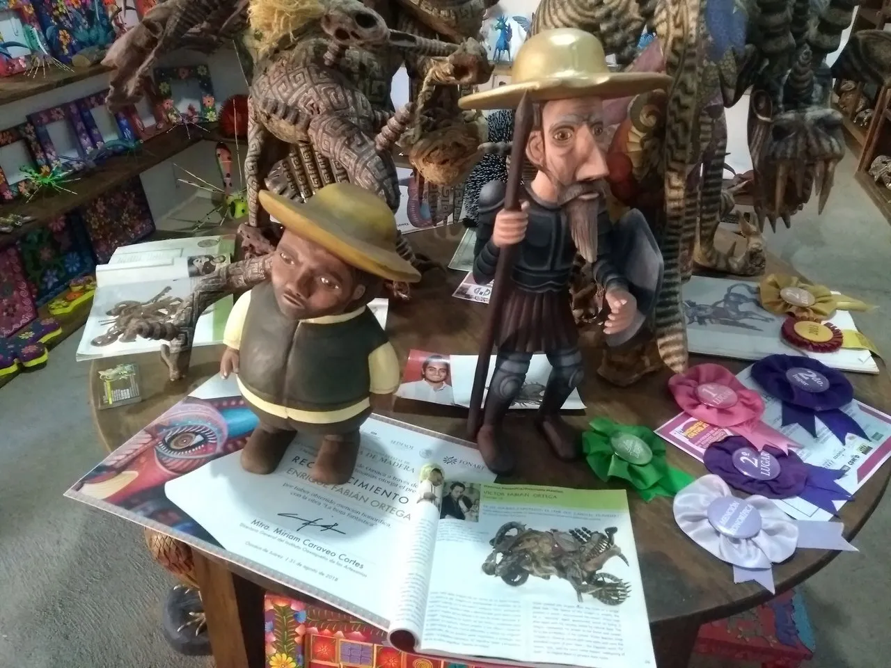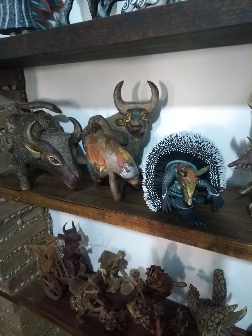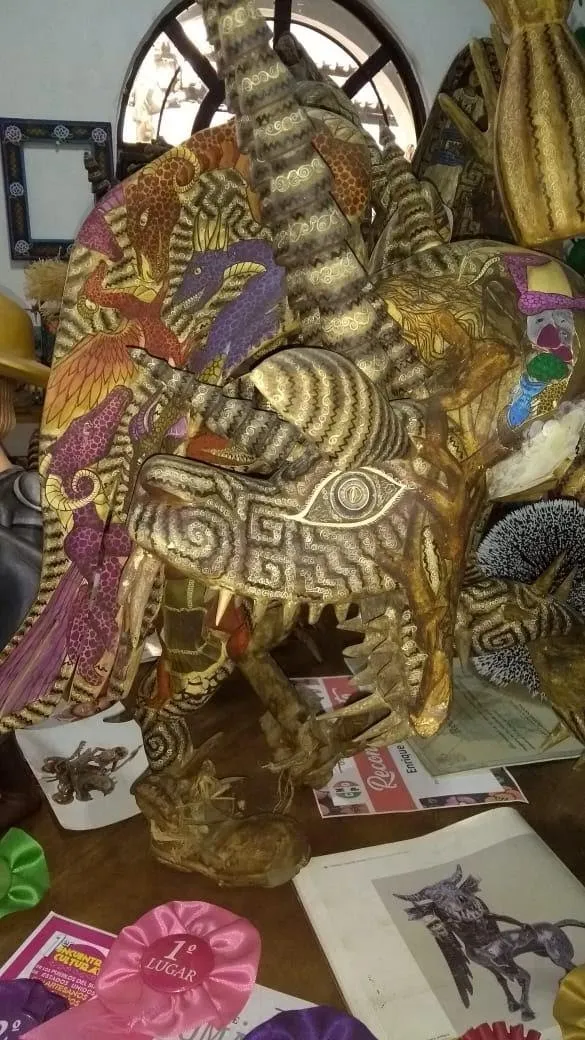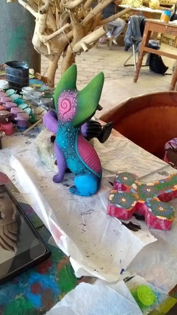 Algo que nos gustó mucho es que el taller está conformado por una familia. Conocimos a varios de ellos y todos fueron muy amables y amigables. Nos dieron un tour donde nos explicaron el proceso de creación de las piezas, desde el tallado, hasta la pintura y detalles finales. A continuación les compartiremos algunas fotos de la obra de este taller.
