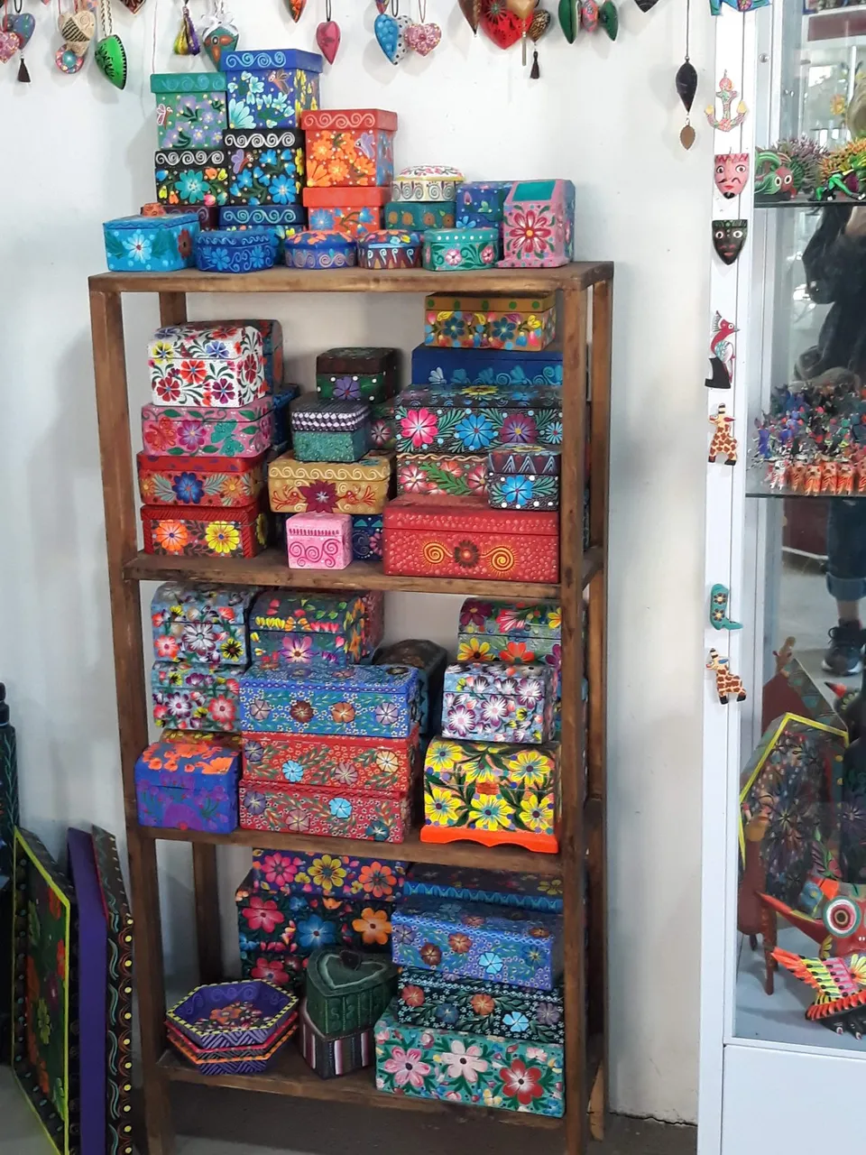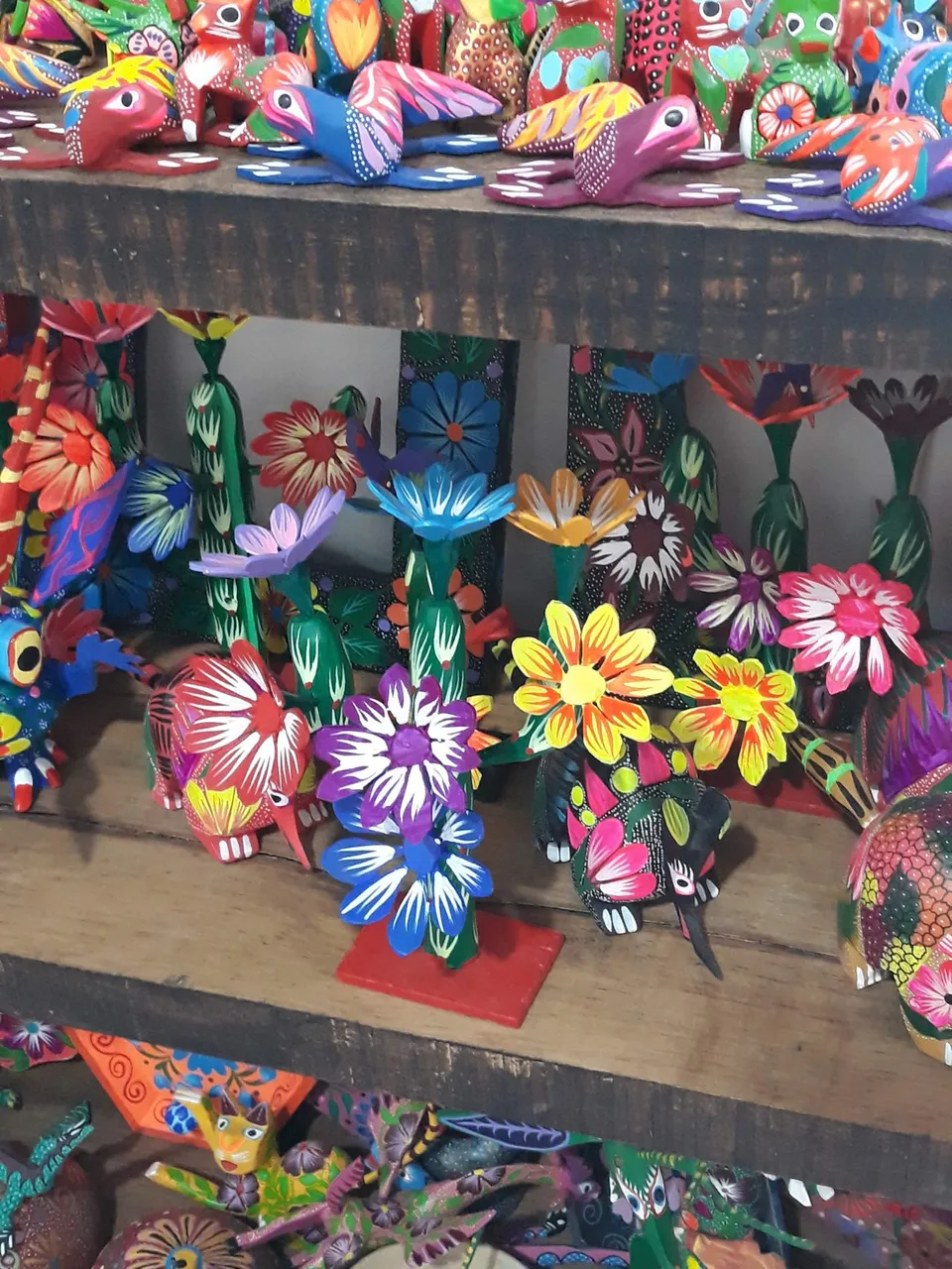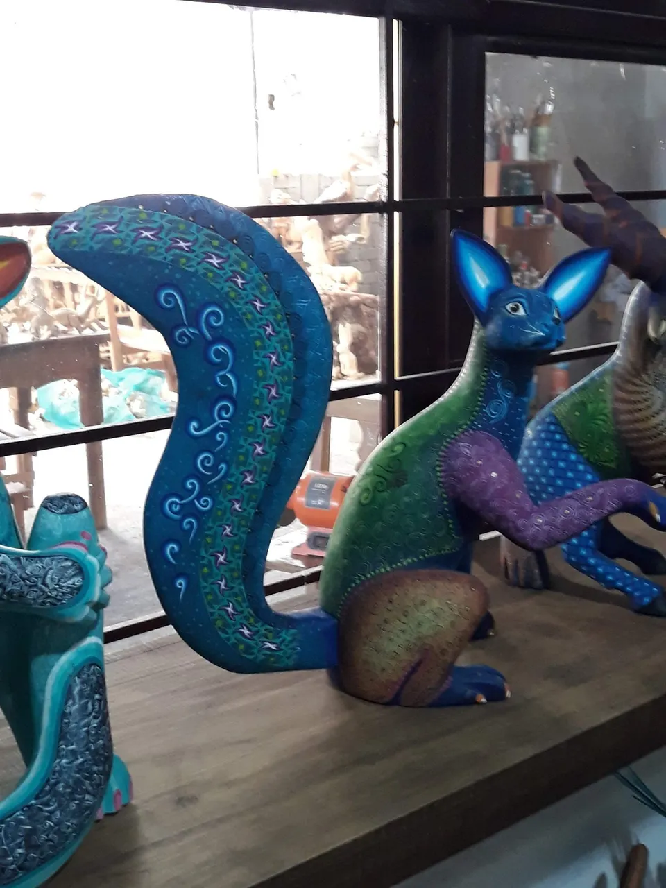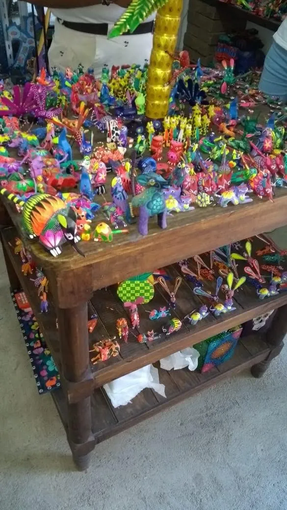 Lo genial y al mismo tiempo curioso de este taller que visitamos en Oaxaca es que ellos hacen los alebrijes de madera tallada y los pintan a mano. La obra artesanal es impresionante, hay de todo tipo de piezas, de calidades, tamaños y precios. Hay piezas desde 100 pesos mexicanos (5 USD) y otras llegan a valer más 30 mil (1,500 USD). El taller no sólo se limita a los alebrijes, también hacen decoraciones de madera como collares, cajas y pintan botellas de mezcal (bebida alcohólica típica de la región). Sus piezas emblemáticas son los dragones con zapatos. Algunas de estas obras han ganado concursos que los han llevado a ser reconocidos internacionalmente.