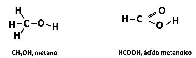 Comparación entre la estructura del metanol y el ácido metanoico. Fuente: @emiliomoron.