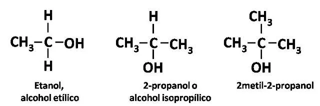 Estructuras de una alcohol 1º, 2º y 3º. Fuente: @emiliomoron.