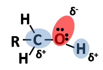 La electronegatividad del oxígeno es considerablemente más grande en comparación con la del hidrógeno y el carbono, esto tiene como consecuencia que los enlaces covalentes de este grupo funcional están polarizados, de modo que el oxígeno es rico en electrones y tanto el carbono como el hidrógeno tienen baja densidad electrónica[2].