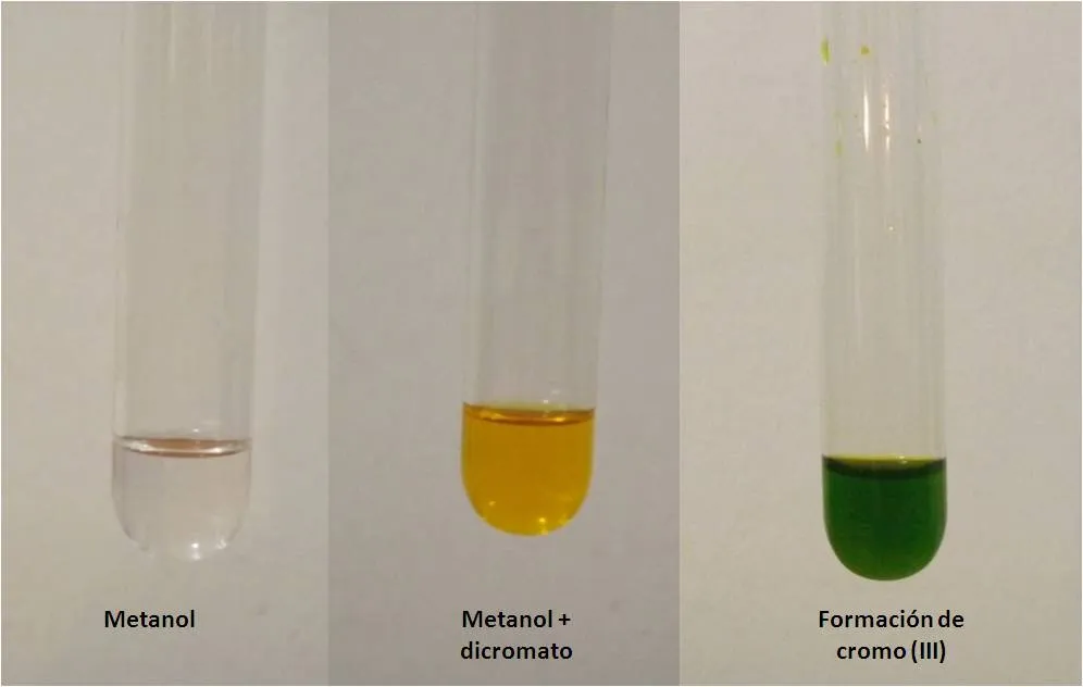 Oxidación de metanol con dicromato de potasio. Fuente: @emiliomoron.