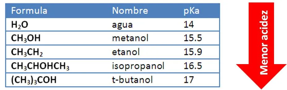 Pka para algunos alcoholes. Fuente: adaptada de chemistrylibretexts.