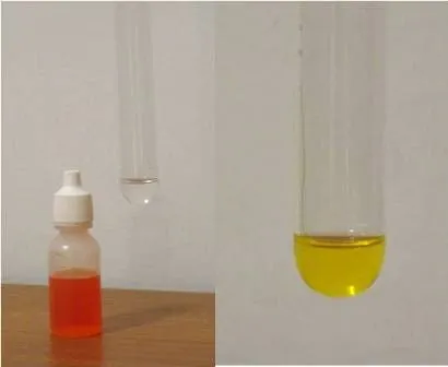 En la siguiente imagen podemos observar la evaluación de la acidez del metanol cuando se le agrega el indicador de pH naranja de metilo, el color amarillo revela el pH ligeramente ácido.