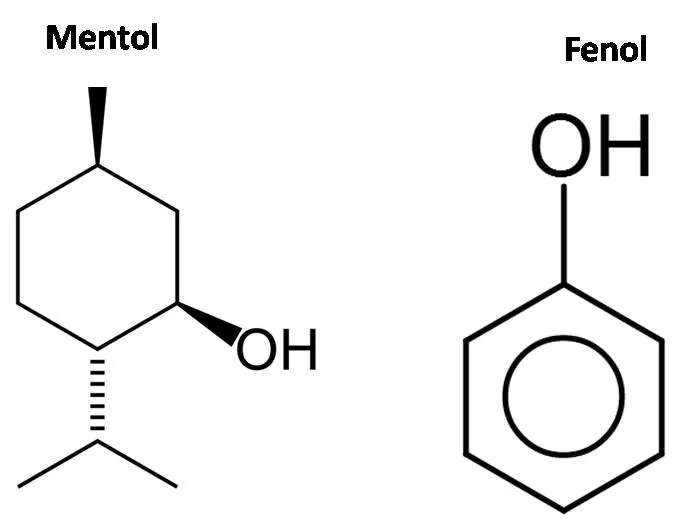 Estructuras de alcoholes con cadenas cíclicas. Fuente: tomado de wikipedia.com y editada por el autor, fuentes originales: mentol y fenol.