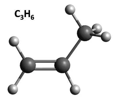 Molécula de propeno, también llamada propileno. Fuente: wikipedia.com, imagen de dominio público.