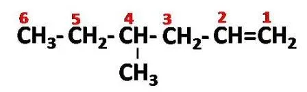 El compuesto se nombraría como 4-metil-1-hexeno. Siempre debemos tener en cuenta que la numeración de la cadena principal se realiza de tal manera que se le dé al doble enlace el número más bajo. El doble enlace siempre tiene prioridad en la numeración, incluso si eso le da al los sustituyentes los números más altos.
